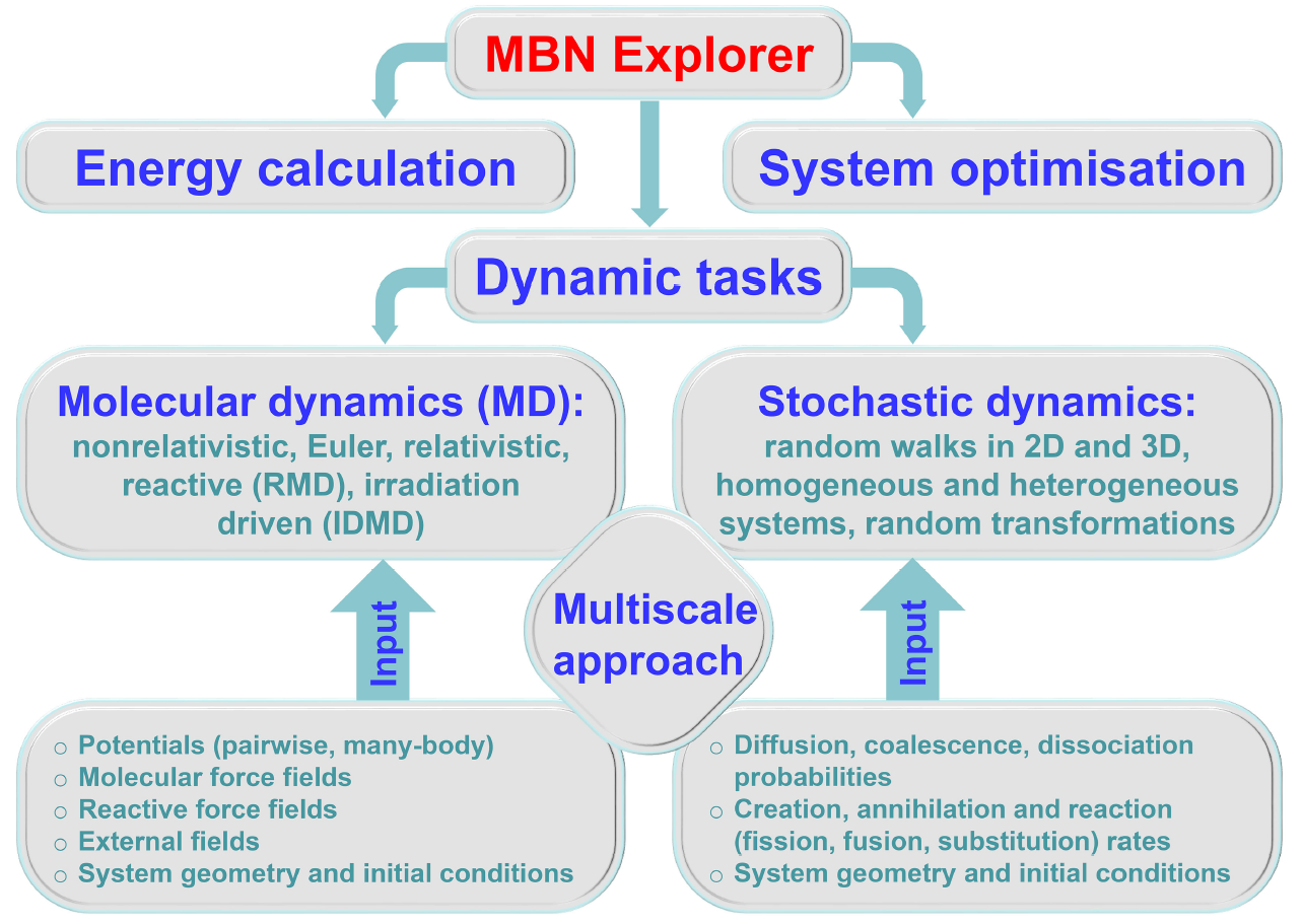 The general modular structure of MBN Explorer in its current version is shown in the diagram. MBN Explorer allows the calculation of energies of a wide variety of MBN systems and the optimisation of their structures. The software package supports several types of molecular dynamics (MD), including classical non-relativistic, irradiation-driven, reactive, Eulerian, and relativistic MD. These types of simulations use a large library of interatomic potentials implemented in the software, enabling many different systems to be modelled. It is also possible to simulate the dynamics of MBN systems in the presence of external electric, magnetic and gravitational fields, as well as electromagnetic waves. MBN Explorer also supports the simulation of random walk dynamics and many other stochastic processes in many different MBN systems. These simulations are based on the Monte Carlo approach using input parameters obtained from MD simulations. Such a methodology becomes very useful and efficient for the computational modelling of numerous multiscale phenomena occurring in different MBN systems on temporal and spatial scales inaccessible to MD.